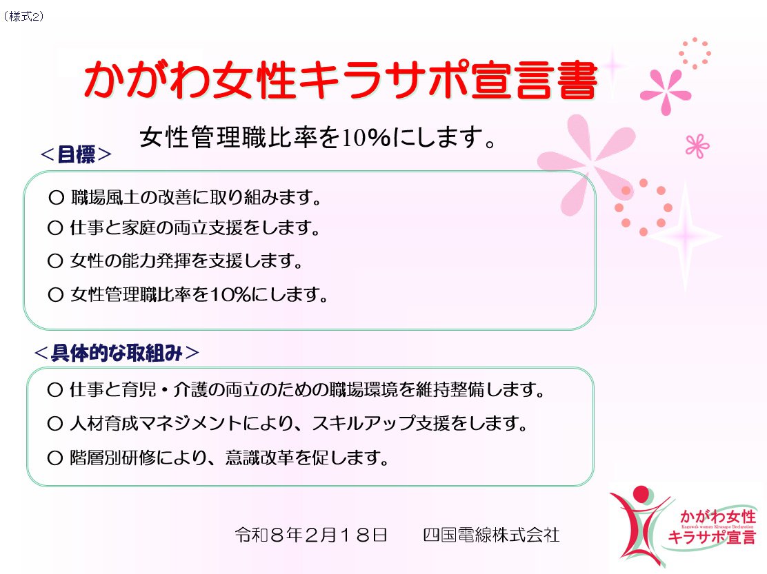 当社は香川県の認定推進事業「かがわ女性キラサポ宣言」に登録し、女性が能力を十分に発揮できる職場環境づくりおこなっています。