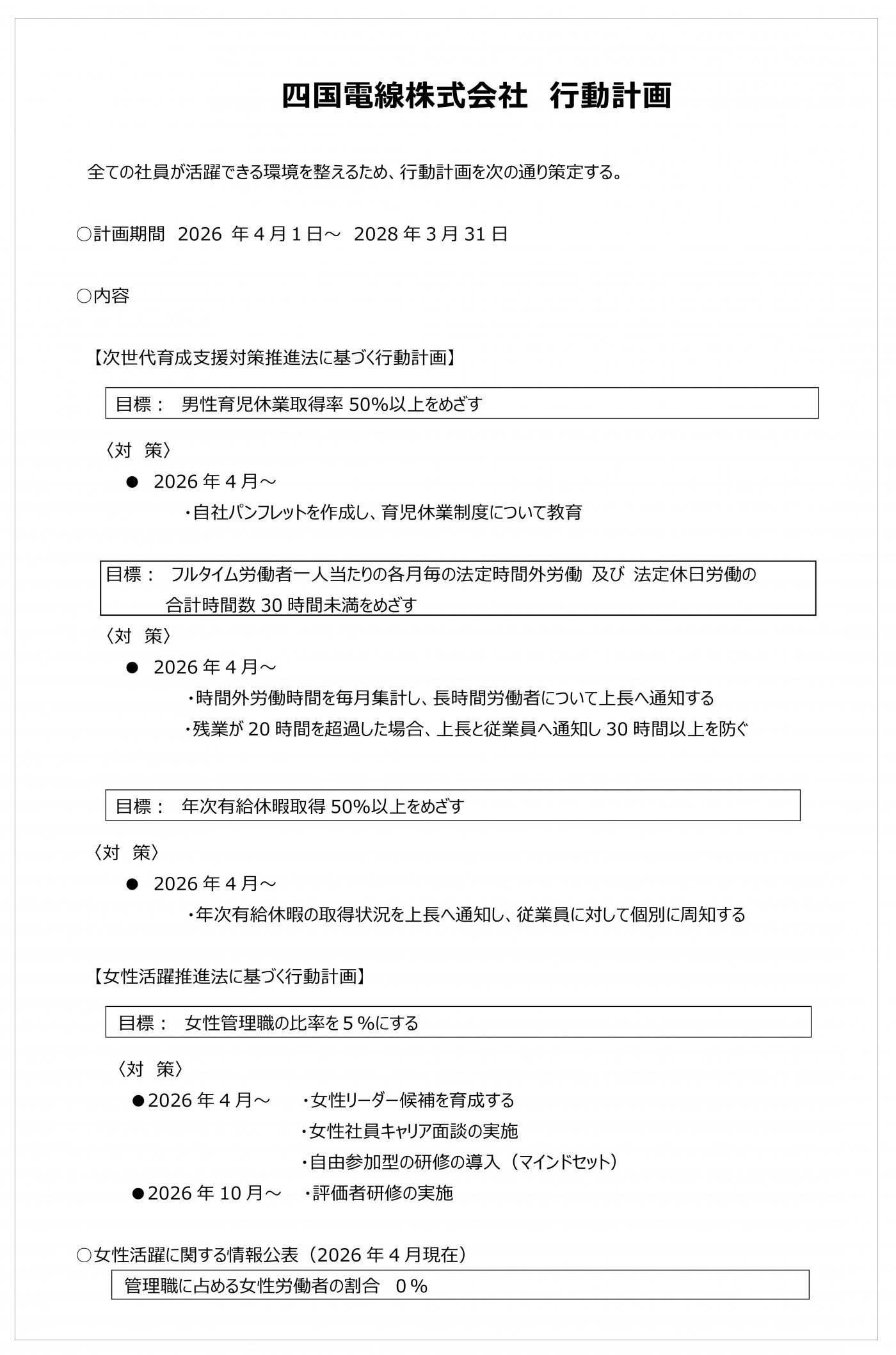次世代育成支援対策推進法・女性活躍推進法に基づき従業員の仕事と子育ての両立や女性の活躍推進を図るため計画し活動しています。